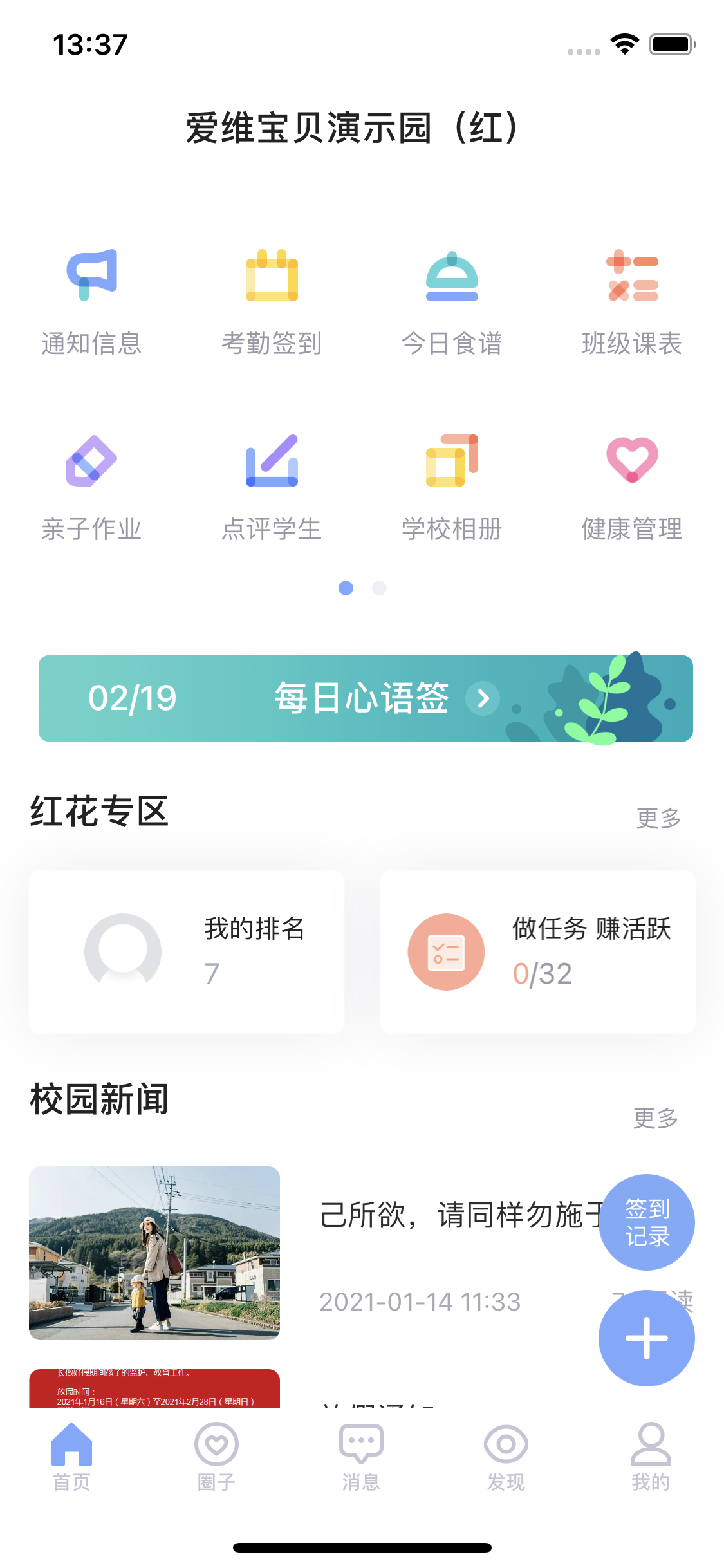 資訊精準(zhǔn)推送,工作高效認(rèn)可高通知一鍵送達(dá),信息反饋及時(shí)知曉圈子即時(shí)交流,家園共育暢享生活