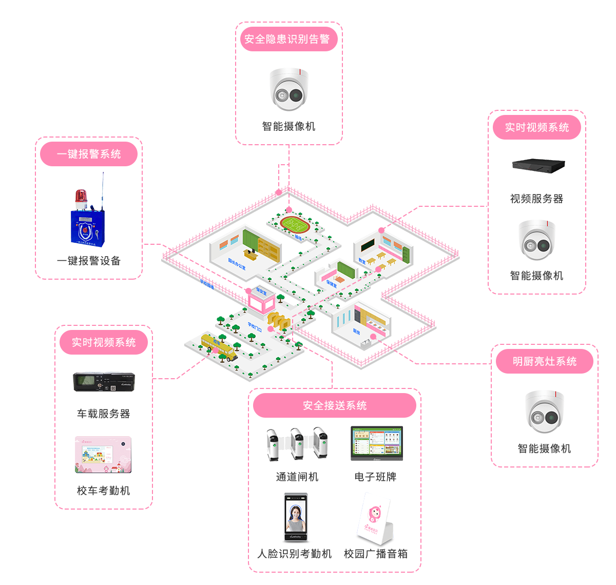 與公安部門聯(lián)網(wǎng),一鍵快速報警,視頻上推共 享,園所警情及時處理